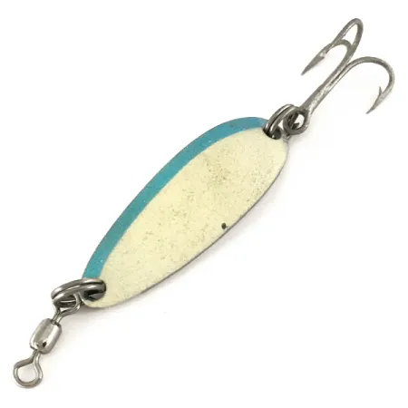 Ta wahadłówka o wadze 1/3 oz (9 g), wykonana z grubej blachy, została zaprojektowana z myślą o rzutach pod silny wiatr oraz obławianiu głębokich miejscówek. Korpus o długości 1 1/2 cala (4 cm) charakteryzuje się perłowobiałym wykończeniem z niebieskim paskiem wzdłuż krawędzi, natomiast druga strona jest pokryta polerowanym niklem. Na spodniej stronie wyraźnie wybito oznaczenia Luhr Jensen oraz Krocodile, co odpowiada kodowi produktu 7543. Egzemplarz jest zachowany w idealnym stanie (5/5) i posiada oryginalne uzbrojenie, w skład którego wchodzą mocne kółka łącznikowe, krętlik baryłkowy zamontowany na oczku oraz kotwiczka. Zgodnie z zamysłem producenta, ta przynęta to klasyczna wahadłówka, która podczas prowadzenia wpada w ruch kolebiący, skutecznie imitując naturalny pokarm. Specyficzny stosunek masy do wielkości serii Krocodile sprawia, że blacha tonie szybciej niż cieńsze modele, przez co stanowi ona żelazną pozycję w pudełku wędkarzy polujących na pstrągi i łososie. Wyraźne tłoczenia oraz lśniące, metaliczne wykończenie tyłu świadczą o tym, że przynęta była starannie przechowywana.