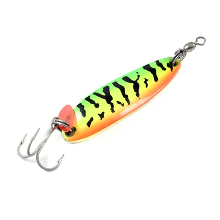 Głęboko wybita na mosiężnym rewersie nazwa „KROCODILE” oraz oznaczenie „DIE #3” potwierdzają, że ta wahadłówka Luhr Jensen to autentyczny amerykański klasyk. Przy wadze 1/2 oz (14 g) i długości 2 1/4" (5,5 cm), model ten jest odpowiednio dociążony, aby docierać do głębszych partii wody, w których czają się drapieżniki. Przednia strona posiada klasyczne malowanie Fire Tiger z wyraźnymi, czarnymi pionowymi pasami przechodzącymi przez neonową zieleń i żółć aż po intensywnie pomarańczowy ogon. Wykończenie ocenione na 5/5 jest wyjątkowo staranne, co pozwala zachować pierwotny blask polerowanego mosiądzu na odwrocie. Przynęta jest uzbrojona w mocne kółko łącznikowe i ostrą kotwicę, którym towarzyszy charakterystyczny czerwony wabik z tworzywa, tworzący wyraźny punkt ataku tuż przy haku. Górna część wyposażona jest w krętlik baryłkowy, który pomaga zapobiegać skręcaniu się linki podczas rzutów lub trollingu. Ten konkretny model o kodzie produktu 2736 odzwierciedla wysokie standardy produkcji, jakie firma Luhr Jensen utrzymuje dla swoich profesjonalnych wahadłówek.
