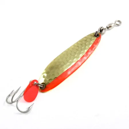 Struktura młotkowanego mosiądzu tworzy wielopłaszczyznową powierzchnię tej 10-gramowej (1/3 oz) wahadłówki, a wyraźny czerwony pasek na boku dodatkowo zwiększa jej widoczność w wodzie. Ta wahadłówka Luhr Jensen Krocodile Die #3, oznaczona kodem produktu 2870, posiada klasyczne tłoczenie marki z Hood River w stanie Oregon na polerowanej wewnętrznej stronie. Przy długości 5,5 cm (2 1/4"), grubościenna konstrukcja przynęty została zaprojektowana z myślą o wędkarzach potrzebujących dalekich rzutów z brzegu lub pomostu. Uzbrojenie uzupełnia krętlik baryłkowy oraz kotwica z jaskrawoczerwonym wabikiem. Ten egzemplarz jest w doskonałym stanie, z nienagannym wykończeniem zasługującym na ocenę 5/5. Wędkarze często wybierają ten konkretny profil ze względu na łatwość rzutów pod wiatr i szybkie opadanie, co pozwala dosięgnąć ryb żerujących w głębszych partiach wody.