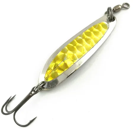 Wybity na odwrocie niklowanego korpusu napis „HOOD RIVER, ORE.” podkreśla klasyczne korzenie tej wahadłówki Luhr Jensen. Front przynęty pokrywa intensywna złota folia holograficzna z wyraźnym wzorem plastra miodu, zaprojektowana tak, by skutecznie odbijać światło podczas pracy w wodzie. Dzięki wadze 10 g (1/3 oz) oraz wąskiej konstrukcji z grubej blachy, model Die #3 doskonale nadaje się do dalekich rzutów oraz stabilnego trzymania głębokości w trollingu. Przy długości 5,5 cm (2 1/4"), przynęta jest uzbrojona w solidną kotwicę i krętlik baryłkowy, połączone wytrzymałymi kółkami łącznikowymi. Wysoką jakość wykonania potwierdzają głęboko tłoczone napisy na rewersie, wskazujące na konkretną matrycę użytą w procesie produkcji. Stan oceniany jest na 5/5 – lśniące, niklowane wykończenie tyłu oraz złota folia na froncie pozostają w nienaruszonym stanie. To świetnie zachowany egzemplarz z serii o kodzie produktu 5643.