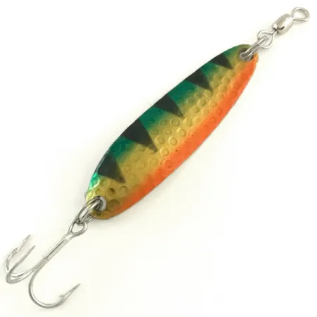 Wahadłówka Luhr Jensen Krocodile w rozmiarze #3 o długości 5,5 cm (2 1/4 cala) wyróżnia się charakterystyczną, młoteczkowaną fakturą powierzchni, która tworzy w wodzie wielokierunkowe refleksy. Ta błystka o wadze 10 g (1/3 oz), oznaczona kodem produktu 6631, została wykończona w jaskrawym malowaniu Fire Tiger z jasnopomarańczowym brzuchem przechodzącym w zielony grzbiet zdobiony ciemnymi, pionowymi pasami. Pod wpływem promieniowania ultrafioletowego pigmenty fluorescencyjne intensywnie świecą, co jest rozwiązaniem technicznym zaprojektowanym specjalnie w celu zachowania widoczności przynęty na dużej głębokości lub w słabym oświetleniu. Wyprodukowana w USA przynęta jest uzbrojona w ostrą kotwicę i wyposażona w krętlik przy oczku, co zapobiega skręcaniu się linki. Stan tego egzemplarza vintage oceniany jest na pewne 5/5, a powłoka lakiernicza i elementy zbrojenia pozostają w nienaruszonym stanie. Na wypukłej stronie widoczny jest charakterystyczny wzór tłoczenia, natomiast na wklęsłym tyle znajduje się sygnatura producenta, odzwierciedlająca utylitarny design, z którego słynie Luhr Jensen.