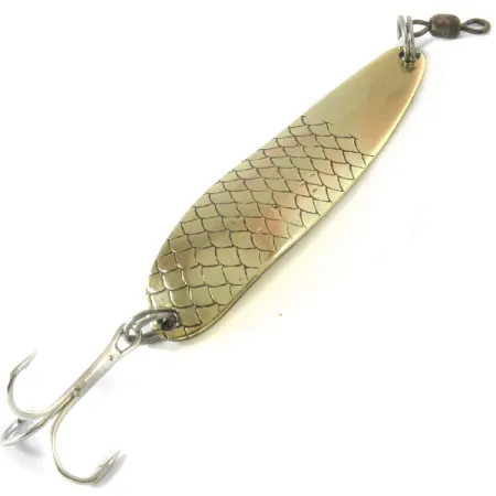 Ważąca 14 g (1/2 oz) błystka wahadłowa wykonana z litego mosiądzu charakteryzuje się starannie wytłoczonym wzorem łusek, który pokrywa dolne dwie trzecie jej powierzchni. Luhr Jensen Krocodile Die #4 to podstawowa przynęta dla wędkarzy polujących na łososie i pstrągi, szczególnie w rejonie Wielkich Jezior, gdzie konieczne jest posyłanie wabika na duże odległości w celu sięgnięcia głębszych partii wody. Przy długości 6,5 cm (2 1/2"), jej wąski i gruby profil został zaprojektowany tak, aby z łatwością przebijać się przez wiatr i stawiać minimalny opór w wodzie. Na rewersie przynęty widnieje klasyczne tłoczenie „KROCODILE” DIE #4 wraz z oznaczeniem producenta LUHR JENSEN HOOD RIVER, ORE., co potwierdza jej pochodzenie z regionu Pacific Northwest. Ten egzemplarz, oznaczony kodem produktu 4106, zachowany jest w stanie 5/5, prezentując jasne i równomierne złote wykończenie na całej powierzchni. Uzbrojenie obejmuje solidne kółko łącznikowe przy oczku oraz mocną kotwicę na ogonie, co czyni ją niezawodnym narzędziem zarówno do rzutów z mola, jak i do trollingu. Podczas jednostajnego prowadzenia wahadłówka pracuje wyraźnym ruchem kolebiącym, który skutecznie imituje żywą rybkę.