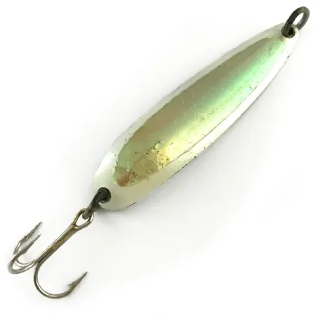 Ta wahadłówka o wadze 19 g (2/3 oz) wyróżnia się charakterystycznym wzorem holograficznej rybiej łuski, która odbija światło subtelnymi refleksami różu i zieleni. Przednia strona została wykończona w kolorystyce White / Pink Green Hologram, natomiast na rewersie widnieje klasyczne tłoczenie „KROCODILE” wraz z marką Luhr Jensen i ich historyczną lokalizacją Hood River w stanie Oregon. Model Die #4 o długości 6,5 cm (2 1/2") i kodzie produktu 6131 posiada grubszy i węższy profil niż standardowe błystki, co ułatwia oddawanie bardzo dalekich rzutów. Zbrojenie obejmuje solidne kółko łącznikowe przy oczku oraz srebrną kotwicę na ogonie. Ten konkretny egzemplarz jest w stanie 5/5, a powłoka oraz tłoczone napisy na odwrocie pozostają wyraźne i w pełni czytelne. Przynęta, ceniona przy połowie łososi i pstrągów, dzięki specyficznemu rozłożeniu masy skutecznie dociera do głębszych partii wody. Chromowany tył generuje silne błyski, które wyraźnie kontrastują z perłowym, holograficznym przodem.