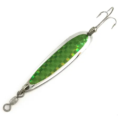 Ta klasyczna wahadłówka Luhr Jensen o długości 6,5 cm (2 1/2") to podstawowy element wyposażenia wędkarzy polujących na grube ryby w głębokiej wodzie. Wykończenie z polerowanego niklu na tej 14-gramowej (1/2 oz) błystce uzupełnia intensywnie zielona taśma holograficzna, pokrywająca większość wypukłej strony. Na wklęsłej części korpusu wyraźnie wybito nazwę „Krocodile” oraz miejsce produkcji: Hood River, OR, USA. Przynęta posiada mocną kotwicę osadzoną na solidnym kółku łącznikowym oraz krętlik baryłkowy na przednim końcu, co zapobiega skręcaniu linki podczas rzutów lub trollingu. Ten konkretny egzemplarz, oznaczony kodem 6490, jest w stanie fabrycznym, otrzymując notę 5/5 za idealny stan powierzchni i ostre zbrojenie. Luhr Jensen zaprojektował model Die #4 z grubszym i węższym profilem niż w tradycyjnych wahadłówkach, co ułatwia oddawanie dalekich rzutów z nabrzeży lub łodzi. Zdolność zielonego wzoru pryzmatycznego do odbijania światła idealnie wpisuje się w zmienne warunki panujące podczas połowu łososi i pstrągów.
