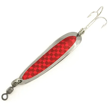Efektowna taśma pryzmatyczna w czerwoną szachownicę tworzy wyraźne refleksy na tle polerowanego niklu tej amerykańskiej wahadłówki. Przy wadze 17 g (3/5 oz), model Krocodile Die nr 4 o długości 6,5 cm (2 1/2") został zaprojektowany jako przynęta niezwykle uniwersalna. Firma Luhr Jensen nadała jej gruby i wąski profil, co ułatwia oddawanie bardzo dalekich rzutów i pozwala skutecznie sięgać do głębokich partii wody, dzięki czemu stała się ona podstawowym wyborem łowców łososi z Wielkich Jezior oraz wędkarzy łowiących z morskich falochronów. Na rewersie wyraźnie wybito logo KROCODILE, co potwierdza solidną konstrukcję, jakiej kolekcjonerzy oczekują od klasycznego amerykańskiego sprzętu wędkarskiego. Zbrojenie pozostaje solidne i obejmuje fabrycznie zamontowany krętlik, który minimalizuje skręcanie linki, oraz ostrą kotwicę zamocowaną na mocnym kółku łącznikowym. Ten egzemplarz, oznaczony kodem produktu 6554, jest w doskonałym stanie, ocenionym na 5/5. Niezależnie od tego, czy łowisz z brzegu, czy uprawiasz trolling, jej konstrukcja zapewnia stabilną pracę i charakterystyczne kolebanie przy różnych prędkościach prowadzenia. To konkretne połączenie niklu i czerwieni to klasyczny wybór do imitowania rannej rybki, sprawdzający się zarówno w wodach słodkich, jak i słonych.