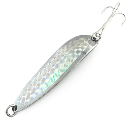 Ciężka konstrukcja o wadze 28 g (1 oz) sprawia, że ta wahadłówka osiąga głębokości i dystanse, które dla lżejszych przynęt są po prostu nieosiągalne. Mierząca 8,5 cm (3 1/4") błystka Luhr Jensen Krocodile Die #5 posiada polerowane, niklowane wykończenie od spodu, natomiast jej wypukła strona pokryta jest srebrną taśmą holograficzną o wzorze rybiej łuski. Tłoczone detale na rewersie wyraźnie wskazują na jej pochodzenie z Hood River w stanie Oregon, co czyni ją autentycznym elementem historii marki Luhr Jensen. Dla wędkarzy polujących na łososie lub pstrągi na dużych akwenach, jej gruby i wąski profil został zaprojektowany tak, aby przy średnim tempie prowadzenia generować stabilną pracę wahadłową, imitującą ranną rybkę. Ten egzemplarz, oznaczony kodem produktu 8576, jest w stanie 5/5 – lśni i jest doskonale zachowany. Przynęta jest uzbrojona w standardowy, wytrzymały osprzęt, w tym mocną kotwicę i duże przednie kółko łącznikowe.