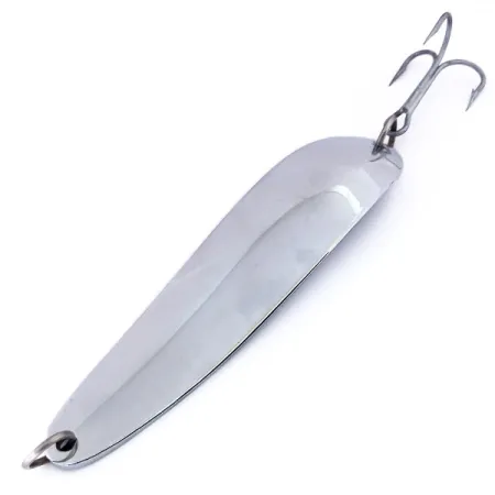 Stal niklowana zapewnia doskonałą widoczność i mocne odblaski w modelu Die #7, który jest prawdziwym klasykiem wśród ciężkich błystek wahadłowych. Wahadłówka o długości 13 cm charakteryzuje się wąskim i grubym profilem, zaprojektowanym tak, aby skutecznie przecinać powietrze i umożliwiać oddawanie maksymalnie dalekich rzutów. Na wewnętrznym profilu wyraźnie wybito nazwę marki „KROCODILE” wraz z oznaczeniem „LUHR JENSEN - HOOD RIVER, ORE.” oraz wagą „3 1/4 OZ”. Ten egzemplarz o kodzie produktu 10186 jest w stanie nieużywanym (5/5) i posiada oryginalne, fabryczne kółka łącznikowe oraz dużą kotwicę. Przy wadze 94 g rozkład masy został opracowany z myślą o prezentacji przynęty w głębokich partiach wody oraz uzyskaniu stabilnej pracy wahadłowej podczas zwijania. Po obu stronach zastosowano wzmocnione kółka łącznikowe, dzięki którym uzbrojenie wytrzyma przeciążenia powstające podczas holu silnej ryby.