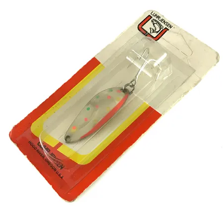 Intensywnie świecące w świetle UV wykończenie Trout UV tego egzemplarza eksponuje serię jaskrawych, fluorescencyjnych kropek na perłowobiałym podkładzie. Przy masie 11,3 g (2/5 oz), ta wahadłówka Luhr Jensen Krocodile Stubby oferuje zwarty profil przy długości 5,1 cm (2 cale), co czyni ją wyspecjalizowanym wyborem dla wędkarzy łowiących w głębszych partiach wody. Ten konkretny model, oznaczony kodem produktu 6231, posiada wyraźny, fluorescencyjny czerwony pasek wzdłuż jednej krawędzi, który tworzy mocny kontrast z nakrapianym wzorem. Wyprodukowana w USA, błystka oferowana jest w oryginalnym, klasycznym blistrze. Uzbrojenie pozostaje w nienagannym stanie i obejmuje klasyczną srebrną kotwiczkę zamocowaną na wytrzymałym kółku łącznikowym. Przynęta jest nieużywana, a jej stan oceniono na 6. Wariant Stubby z legendarnej linii Krocodile jest rzadziej spotykany, szczególnie w tej specjalistycznej wersji kolorystycznej z efektem świecenia, zaprojektowanej dla lepszej widoczności w mętnej wodzie lub w głębszych warstwach toni.