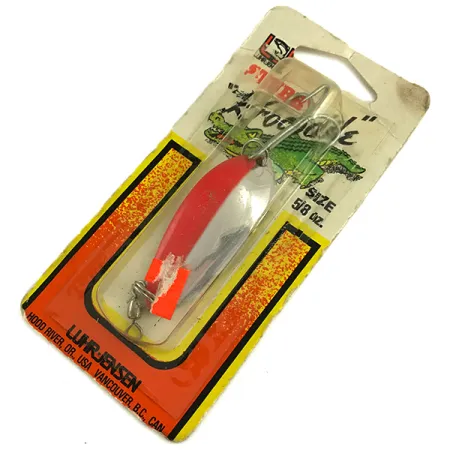 Czerwona emalia pokrywa połowę niklowanego korpusu tej specjalistycznej wahadłówki, co zapewnia wyraźny kontrast wizualny podczas prezentacji na głębokiej wodzie. Przy długości 5,5 cm (2 1/4") i wadze 18 g (2/3 oz), model Stubby cechuje się bardziej zwartym profilem w porównaniu do standardowej sylwetki Krocodile. Egzemplarz ten, oznaczony kodem produktu 6053, stanowi świadectwo historii produkcji marki Luhr Jensen z czasów, gdy firma działała w Hood River w stanie Oregon oraz w Vancouver w Kolumbii Brytyjskiej. Przynęta jest nieużywana, fabrycznie zamknięta w oryginalnym opakowaniu vintage z grafiką aligatora, która jest symbolem tej serii. Solidny krętlik baryłkowy jest już zamocowany do oczka przynęty, natomiast na odwrocie blistra znajdują się informacje o możliwości zamówienia kolorowego, 48-stronicowego katalogu z lat 80.