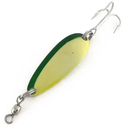 Pokryta wyrazistą powłoką UV o wysokiej widoczności, ta wahadłówka posiada charakterystyczny zielony pasek wzdłuż krawędzi fosforyzującego korpusu. Ważąca 9 g (1/3 oz) przy długości 4 cm (1 1/2"), wahadłówka Luhr Jensen Krocodile UV (kod produktu 7542) została zaprojektowana z myślą o uzyskiwaniu znacznych odległości rzutowych. Właściwości luminescencyjne są doskonale widoczne w warunkach słabego oświetlenia, gdzie kremowobiała powierzchnia emituje jasnozieloną poświatę, ułatwiając drapieżnikom namierzenie przynęty w głębokiej wodzie. Ten egzemplarz jest uzbrojony w srebrną kotwicę oraz zintegrowany krętlik baryłkowy, który zapobiega skręcaniu się linki podczas rzutów lub trollingu. Wyprodukowana w USA, jej wąska konstrukcja z grubej blachy pozwala skutecznie przebijać się przez powietrze i docierać do strefy brań. Powłoka lakiernicza oraz osprzęt są w doskonałym stanie, co odzwierciedla ocena 5/5. Sygnatura na spodniej stronie potwierdza, że jest to oryginalny produkt marki Luhr Jensen.