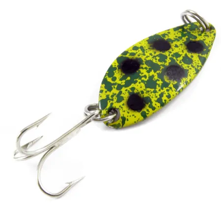 Przód tej błystki wahadłowej o długości 1 1/4" (3 cm) pokrywa nakrapiana żółto-zielona malatura z pięcioma dużymi czarnymi kropkami – wzór ten powszechnie nazywany jest „Frog”. Rewers charakteryzuje się wykończeniem z polerowanego niklu z wyraźnym grawerem „LITTLE CLEO”, który identyfikuje ją jako oryginalny produkt Seneca Lure wyprodukowany w USA. Ważący 1/8 oz (4 g) egzemplarz posiada kod produktu 3273 i pochodzi z okresu sprzed przejęcia firmy przez markę Acme na początku lat 80. Uzbrojenie obejmuje oryginalne kółka łącznikowe oraz ostrą kotwiczkę, a całość zachowana jest w stanie 5/5, bez żadnych śladów używania. Ta konkretna przynęta to klasyk przy łowieniu pstrągów lub mniejszych drapieżników, a jej zwarta, metalowa konstrukcja sprzyja dalekim rzutom mimo niewielkich rozmiarów.