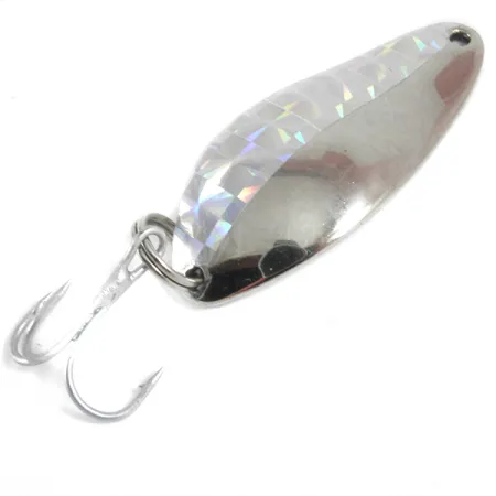 Na rewersie polerowanego korpusu głęboko wytłoczono napis „LITTLE CLEO WIGL-LURE A SENECA LURE”, co pozwala zidentyfikować ten egzemplarz jako produkt powstały przed przejęciem firmy Seneca przez Acme na początku lat 80. Ta niklowana wahadłówka o długości 4 cm (1 1/2") i wadze 7 g (1/4 oz) charakteryzuje się klasycznym, szerokim profilem w kształcie kropli, zaprojektowanym specjalnie z myślą o dalekich rzutach. Jedna strona przedniej części została pokryta holograficzną folią pryzmatyczną o geometrycznym wzorze w trójkąty, co zapewnia dodatkowe refleksy świetlne w wodzie. Przynęta wyprodukowana w USA (kod produktu 3649) jest w doskonałym stanie, ocenionym na 5/5, i nie nosi śladów użytkowania. Uzbrojenie stanowi ostra, srebrna kotwiczka zamocowana na solidnym kółku łącznikowym u podstawy błystki.