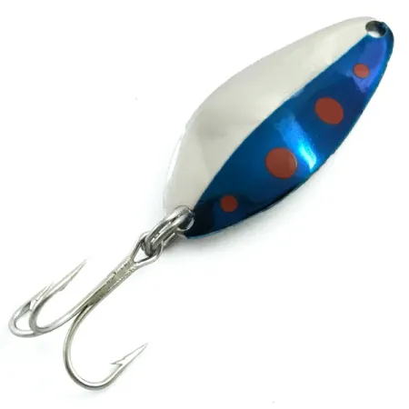 Niklowana powierzchnia tej klasycznej wahadłówki zdobiona jest pięcioma pomarańczowo-czerwonymi kropkami na tle ciemnoniebieskiego, metalicznego panelu. Przy wadze 1/4 oz (7 g) i długości 1 1/2" (4 cm), przynęta charakteryzuje się znaczną grubością, właściwą dla oryginalnych wyrobów Seneca Lure Company z USA. Na rewersie widnieje wyraźna sygnatura „LITTLE CLEO WIGGLE-LURE A SENECA LURE”, co potwierdza produkcję sprzed przejęcia marki przez firmę Acme na początku lat 80. Egzemplarz o kodzie produktu 5460 zachowany jest w stanie 5/5, z czystym i lśniącym wykończeniem zarówno po stronie barwnej, jak i niklowanej. Oryginalna kotwica pozostaje ostra i jest osadzona na solidnym kółku łącznikowym, co świadczy o wysokiej jakości osprzętu z tamtych lat. Ten konkretny wariant kolorystyczny, łączący naturalny błysk z wyraźnymi niebieskimi i czerwonymi akcentami, stanowił podstawę wyposażenia wędkarzy polujących na różne gatunki ryb słodkowodnych.