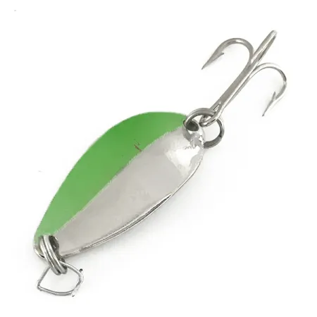 Ta klasyczna wahadłówka o wadze 5 g (3/16 oz) w dwukolorowym wykończeniu Nikiel / Zielony oferuje tradycyjny profil wizualny, idealny do spinningu lub trollingu. Przy długości 3 cm (1 1/4 cala), na polerowanym tyle błystki widnieje wyraźne tłoczenie z nazwą „LITTLE CLEO”, potwierdzające jej pochodzenie z amerykańskiej firmy Seneca Lure. Oznaczony kodem produktu 7417 egzemplarz reprezentuje czasy, zanim Seneca została przejęta przez firmę Acme na początku lat 80. Konstrukcja zawiera kotwicę w kolorze srebrnym, zamocowaną na kółku łącznikowym w dolnej części, oraz drugie kółko na górze, przeznaczone do bezpośredniego mocowania linki. Zielony pigment pokrywa dokładnie połowę wypukłej strony, tworząc wyraźny kontrast z odblaskową, niklowaną powierzchnią. Przynęta jest nieużywana, z czystą i lśniącą powłoką zarówno na częściach malowanych, jak i metalowych z tłoczeniem.