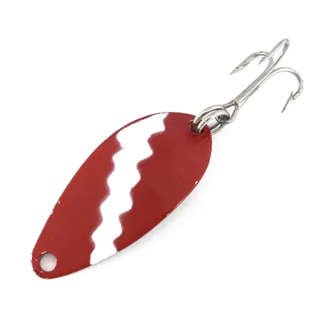 Charakterystyczną cechą tej wahadłówki o długości 1 1/4" (3 cm) jest czerwono-biała malatura naniesiona w wyraźny, falisty wzór na jej wypukłej stronie. Na rewersie z polerowanego niklu wybito oznaczenie „LITTLE CLEO”, co potwierdza pochodzenie przynęty z firmy Seneca Lure jeszcze sprzed jej przejęcia przez Acme na początku lat 80. Ten egzemplarz o masie 1/8 oz (4 g), oznaczony kodem produktu 7783, prezentuje klasyczne amerykańskie rzemiosło, jakiego oczekuje się od przynęt vintage produkcji USA. Powierzchnia zachowała się w wyjątkowo dobrym stanie, co uzasadnia ocenę 5/5 dzięki żywym kolorom i czystemu metalowi. Solidne kółko łącznikowe trzyma lśniącą kotwicę, dzięki czemu błystka jest gotowa do łowienia lub ekspozycji obok innych historycznych przynęt metalowych. Kształt łezki oraz odpowiednie rozłożenie masy czynią z niej wszechstronne narzędzie do różnych technik rzutowych.
