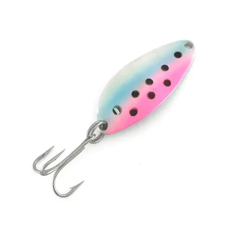 Masa 1/4 oz (7 g) zapewnia tej wahadłówce odpowiedni ciężar, pozwalający na szybkie osiągnięcie docelowej głębokości po rzucie. Malowanie w wariancie Trout charakteryzuje się trzystopniowym przejściem kolorów od białego, przez niebieski, aż po różowy, z czarnymi kropkami w najszerszej części korpusu. Wybity na polerowanym, niklowanym rewersie napis „Little Cleo Wigl-Lure A Seneca Lure” potwierdza, że produkt o kodzie 7937 został wyprodukowany przez firmę Seneca w USA przed przejęciem jej przez Acme na początku lat 80. Błystka o długości 1 1/2" (4 cm) posiada precyzyjnie wykonane oczko oraz zamontowaną z tyłu kotwiczkę. Przy ocenie stanu 5/5 przynęta niemal nie wykazuje śladów upływu czasu, zachowując wyraźny wzór pstrąga oraz blask metalowego wykończenia. Kółko łącznikowe pozostaje ciasne i sprawne, dzięki czemu produkt jest gotowy do natychmiastowego użycia lub ekspozycji w kolekcji.
