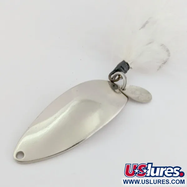 14 g tłoczonego metalu nadaje tej niklowanej wahadłówce solidną masę niezbędną do dalekich rzutów. Na odwrocie błystki znajduje się kultowa sylwetka tancerki „Hula Girl”, znak rozpoznawczy oryginalnej produkcji Seneca Lure z czasów przed przejęciem marki przez Acme na początku lat 80. Wielu wędkarzy wierzy, że to logo tancerki jest sekretem skuteczności przypisywanej oryginalnemu modelowi. Jasne, niklowane wykończenie zapewnia doskonałą widoczność w różnych warunkach wodnych. Błystka o długości 5,5 cm charakteryzuje się wyraźnym, wygiętym profilem oraz kotwiczką z białymi piórami, która dodaje subtelny, pulsujący element wizualny. Stan oceniony na 5/5 – powierzchnia metalu pozostaje wyjątkowo czysta i lustrzana, a oryginalne tłoczenia są ostre i wyraźne. Ten konkretny egzemplarz o kodzie produktu 24509 pochodzi z ery przed Acme.