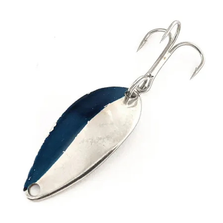 Wyraźny, ciemnoniebieski pas pokrywa około połowy polerowanej, niklowanej powierzchni tej błystki wahadłowej o wadze 1/8 oz (4 g). Ta wahadłówka Little Cleo, wyprodukowana przez firmę Seneca i mierząca dokładnie 1 1/4 cala (3 cm), pochodzi z okresu sprzed lat 80., zanim marka została przejęta przez Acme Tackle Company. Na rewersie znajduje się klasyczny, wyraźnie wybity w metalu napis „LITTLE CLEO”, będący znakiem rozpoznawczym oryginalnych projektów Seneca Lure z USA. Jak na swój wiek, powłoka zachowała się w idealnym stanie (5/5), z lustrzanym blaskiem niklowania oraz czystą, wyraźną krawędzią niebieskiej farby. Błystka jest uzbrojona w pojedynczą, oryginalną kotwiczkę zamocowaną na solidnym kółku łącznikowym, przystosowaną do technik spinningowych i trollingu. Oznaczona kodem produktu 12196, wahadłówka ta posiada unikalny, wygięty profil, zaprojektowany z myślą o uzyskaniu charakterystycznej, bocznej pracy. Kształt łezki pozostaje jedną z najbardziej rozpoznawalnych sylwetek w historii amerykańskiego sprzętu wędkarskiego, szczególnie z tego klasycznego okresu produkcji Seneca.