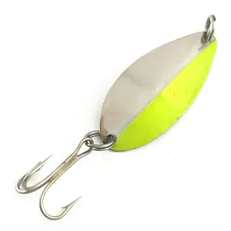 Mająca dokładnie 3 cm (1 1/4") długości wahadłówka Seneca charakteryzuje się klasycznym kształtem łezki, który od dziesięcioleci jest stałym elementem w pudełkach wędkarskich. Wykończenie jest podzielone pionowo przez środek: jedna połowa to jasny, polerowany nikiel dający mocne odblaski, kontrastujący z jaskrawą, fluorescencyjną zielenią drugiej strony. W świetle ultrafioletowym zielona część zaczyna intensywnie świecić, co jest cechą zaprojektowaną specjalnie w celu zwiększenia widoczności w słabych warunkach świetlnych lub w głębszej wodzie. Ten model Little Cleo UV to cieńsza wersja tradycyjnej konstrukcji, opatrzona oryginalnym logotypem Seneca Lure z czasów, zanim firma została przejęta przez Acme na początku lat 80. Przy wadze 1,8 g (1/16 oz) idealnie nadaje się do lekkich zestawów oraz trollingu. Egzemplarz oceniony na 5/5, posiada pięknie zachowaną powierzchnię zarówno po stronie galwanizowanej, jak i malowanej. Oznaczona kodem produktu 6499, ta wyprodukowana w USA przynęta wyposażona jest w oryginalną kotwicę i solidne kółka łącznikowe, stanowiąc pomost między klasyczną metalową konstrukcją a pojawieniem się specjalistycznych powłok fluorescencyjnych w amerykańskim przemyśle wędkarskim.