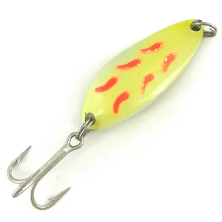 Jaskrawoczerwone wzory wyraźnie kontrastują z żółtym korpusem modelu Little Jewel – klasycznej przynęty typu vintage skatalogowanej pod numerem 7365. Przy długości 4,7 cm (1 3/4") i wadze 9 g (1/3 oz), ta wahadłówka odzwierciedla proste zasady projektowania charakterystyczne dla amerykańskiej produkcji marki Luhr Jensen. Lakier na wyoblonej powierzchni zachował intensywne barwy, a mimo lekkich śladów czasu na osprzęcie, przynęta jest bardzo dobrze zachowana, co pozwala na ocenę jej stanu na solidne 4/5. To wycofany model, który od wielu lat nie figuruje w katalogach, a niegdyś stanowił podstawowy element wyposażenia pudełek wędkarskich w regionie Pacific Northwest. Przynęta jest uzbrojona w srebrną kotwicę zamontowaną na kółku łącznikowym, odpowiednią do spinningu oraz trollingu.