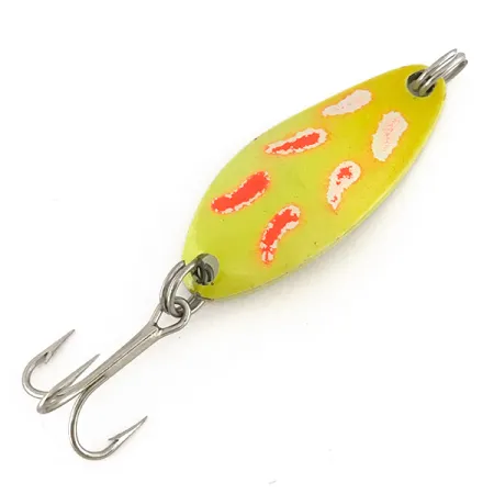 Mierzący dokładnie 4 cm (1 1/2") długości, tłoczony metalowy korpus tej przynęty vintage charakteryzuje się klasycznym żółtym kolorem bazowym, ozdobionym czerwonymi i białymi fluorescencyjnymi wzorami w kształcie łezek. Little Jewel o kodzie produktu 7519 to archiwalny model z czasów amerykańskiej produkcji marki Luhr Jensen, który od wielu lat jest już wycofany z katalogu. Ten konkretny egzemplarz o wadze 7 g (1/4 oz) posiada specjalne wykończenie UV Glow, które staje się doskonale widoczne w warunkach słabego oświetlenia, co przedstawiono na dodatkowych zdjęciach. Uzbrojenie obejmuje kotwicę w oryginalnym stylu, zamocowaną na nierdzewnych kółkach łącznikowych, co pozwala zachować historyczną autentyczność przynęty. Jej stan jest oceniany na 4/5, prezentując żywą kolorystykę i wyraźne oznaczenia, które kolekcjonerzy kojarzą ze sprzętem Luhr Jensen z połowy ubiegłego wieku. Właściwości fluorescencyjne zostały opracowane specjalnie dla zapewnienia widoczności w głębokiej lub mętnej wodzie, gdzie ilość światła naturalnego jest ograniczona.