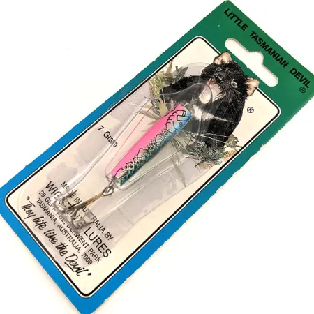 Ważąca 7 g (1/4 oz) przynęta Little Tasmanian Devil to klasyk australijskiej produkcji, zaprojektowany przez firmę Wigston's Lures do szerokiego zakresu zastosowań w spinningu i trollingu. Korpus o długości 4 cm (1 1/2") z charakterystycznymi skrzydełkami wykończono w intensywnym malowaniu Rainbow Trout (Pstrąg Tęczowy), z jasnoróżowym grzbietem przechodzącym w niebiesko-srebrną łuskę z drobnymi czarnymi kropkami. Jako egzemplarz nieużywany (stan 6), przynęta znajduje się w oryginalnym, niebiesko-białym blistrze, opatrzonym kultowym hasłem „They bite like the Devil” oraz adresem 28 Gepp Parade, świadczącym o jej tasmańskim pochodzeniu. Na odwrocie opakowania znajduje się szczegółowa instrukcja zbrojenia – od mocowania agrafki z krętlikiem po bezpośrednie przewlekanie żyłki przez korpus do haczyka i koralika. Ten konkretny egzemplarz jest skatalogowany pod numerem 11568 i posiada tradycyjny, skrzydlaty kształt, z którego marka słynie od samego początku swojego istnienia.