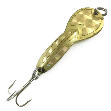 Przednią powierzchnię tej złotej wahadłówki o wadze 1/4 oz (7 g) zdobi fasetowany, odbijający światło wzór. Na rewersie wyraźnie wytłoczono nazwę Glen Evans; model Loco 2 o kodzie produktu 5500 to klasyczny element historii amerykańskiego sprzętu wędkarskiego. Korpus o długości 5 cm (2") jest niezwykle wszechstronny i sprawdza się zarówno w spinningu, jak i trollingu. Model ten jest ceniony za swoją skuteczność podczas łowienia nieaktywnych szczupaków w wodach stojących na głębokościach do 1 m. Złota powłoka wykazuje lekkie ślady użytkowania oraz drobne przetarcia na krawędziach i spodniej stronie, co odpowiada ocenie stanu 4/5. Uzbrojenie obejmuje pojedynczą kotwicę zamocowaną na kółku łącznikowym w tylnej części oraz analogiczne kółko z przodu do pewnego mocowania linki.