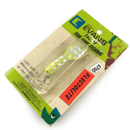 Ta wahadłówka Glen Evans Loco 2 waży 7 g (1/4 oz) i wyróżnia się charakterystyczną fluorescencyjną żółtą obwódką, która reaguje na światło UV. Przy długości 5 cm (2"), błystka posiada srebrny środek z wzorem łuski „Flectolite”, który ma za zadanie odbijać i rozpraszać światło w toni wodnej. Model ten posiada kod produktu 6700 i jest zachowany w oryginalnym, starym opakowaniu typu blister, pochodzącym z Caldwell w stanie Idaho. Przynęta jest nieużywana, a metal i powłoka zachowały ten sam blask, co w dniu opuszczenia fabryki Gladding Corporation. Uzbrojenie stanowi pojedyncza kotwica zamontowana na brzuszku oraz mocne kółko łącznikowe do mocowania linki. Konstrukcja Loco, historycznie stosowana zarówno w spinningu, jak i trollingu, była często wybierana do połowu szczupaków i innych drapieżników na płytkich wodach o głębokości do 0,9 m (3 stopy). Opakowanie podkreśla dziedzictwo Glena L. Evansa, polegające na tworzeniu sprzętu, który ma oszukiwać ryby, a nie tylko wędkarzy.