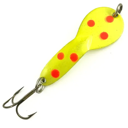 Sześć wyraźnych czerwonych kropek rozmieszczono precyzyjnie na fluorescencyjnym, żółtym korpusie wahadłówki Glen Evans Loco 2 UV o wadze 1/4 oz (7 g). Przy długości 5 cm (2"), model ten wyróżnia się wykończeniem o wysokiej widoczności, reagującym na promieniowanie UV, co jest szczególnie skuteczne w mętnej wodzie lub przy słabym oświetleniu. Spód przynęty stanowi czysta niklowana baza z wybitym oznaczeniem „LOCO 2” tuż przy górnym oczku. Zaprojektowana do spinningu i trollingu, błystka ta jest najczęściej stosowana przy połowie szczupaków w spokojnych wodach na głębokości do 1 m (3,3 ft). Ten egzemplarz, oznaczony kodem produktu 5790, zachowany jest w stanie 5/5 – powłoka lakiernicza i osprzęt nie wykazują żadnych śladów zużycia. Solidne kółka łącznikowe pewnie trzymają ostrą kotwicę, co gwarantuje zachowanie w pełni oryginalnej, fabrycznej konfiguracji.