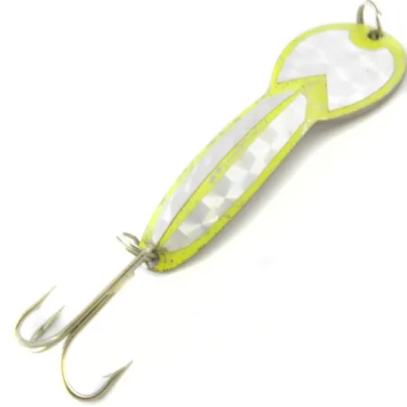 Przy długości 7 cm (2 3/4") i wadze 17 g (3/5 oz), korpus wahadłówki Loco 3 UV ma wyraźny profil, który świetnie sprawdza się zarówno w rzutach, jak i w trollingu. Charakterystycznie wyprofilowana, niklowana blacha została wykończona jaskrawożółtą obwódką otaczającą srebrną, fasetowaną taśmę holograficzną – takie połączenie reaguje na światło UV, zachowując widoczność w różnych warunkach. Na odwrocie przynęty widnieje klasyczne tłoczenie „LOCO”, będące znakiem rozpoznawczym amerykańskiego rzemiosła Glen Evans. Ten konkretny egzemplarz o kodzie produktu 4000 jest w solidnym stanie 4/5, z niewielkimi, naturalnymi śladami użytkowania na powłoce. Idealnie nadaje się do obławiania górnych partii wody, szczególnie na głębokości około 1 metra (3,3 stopy) podczas łowienia szczupaków w wodach stojących. Przynęta uzbrojona jest w pojedynczą kotwiczkę, co zapewnia pewne i skuteczne zacięcie.