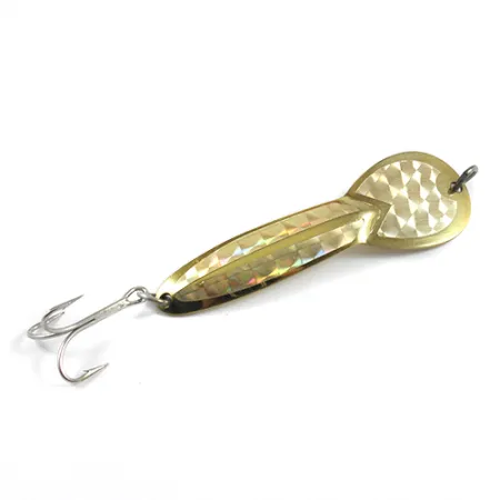 Na rewersie, głęboko w metalu wykończonym w złotym kolorze, wybito charakterystyczną sygnaturę „LOCO”, która identyfikuje ten egzemplarz jako oryginał marki Glen Evans z USA. Wahadłówka o długości 9 cm (3 1/2") posiada szeroki profil w kształcie łezki, który w późniejszych latach został włączony do katalogu Luhr Jensen. Przednia strona pokryta jest mieniącym się, geometrycznym wzorem pryzmatycznym, który nadaje klasycznej złotej bazie dodatkową strukturę wizualną. Waga 23 g (3/4 oz) sprawia, że jest to solidna przynęta do spinningu lub trollingu, szczególnie skuteczna na szczupaki w wodach stojących na głębokości do 1 metra. Skatalogowana pod kodem produktu 2458, przynęta zachowana jest w stanie 5/5, przy czym jej uzbrojenie i powłoka są w doskonałej kondycji. Pojedyncza kotwiczka jest zamontowana na kółku łącznikowym, a drugie kółko znajduje się przy oczku do mocowania linki.