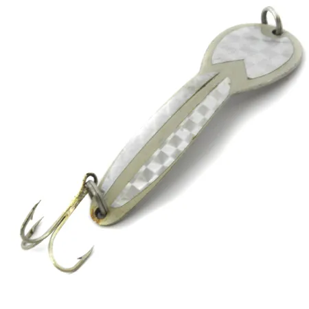 Przy długości 9 cm (3 1/2 cala), smukły profil tej wahadłówki uzupełnia wkładka w kolorze White Pearl o wzorze rombów umieszczona na przedniej części. Na rewersie znajduje się wyraźnie wybite, oryginalne oznaczenie „GLEN EVANS 'LOCO'”, co potwierdza produkcję z okresu przed przejęciem projektu przez markę Luhr Jensen. Ten konkretny egzemplarz, oznaczony kodem produktu 3900, zachowany jest w doskonałym stanie (5/5), z czystym zbrojeniem i lśniącą powłoką. Waga 23 g (3/4 oz) zapewnia masę niezbędną do oddawania dalekich rzutów lub stabilnego prowadzenia w trollingu w toni wodnej. Doświadczeni wędkarze najczęściej sięgają po Loco 4 podczas łowienia szczupaków w płytszych partiach wody, do około 1 m głębokości, gdzie jej intensywna praca doskonale sprawdza się w miejscach bez uciągu. Kółka łącznikowe oraz kotwica są solidnie zamocowane, co odzwierciedla trwałe standardy amerykańskiej produkcji z tamtych lat.