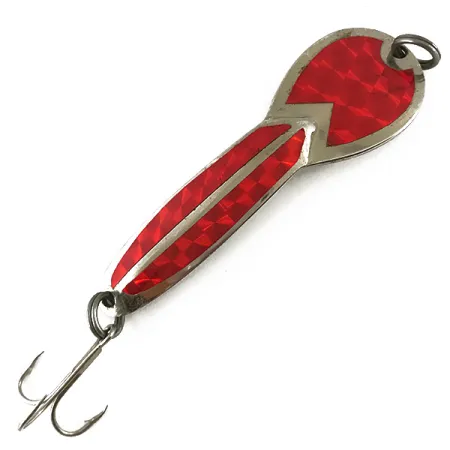 Niklowany spód posiada wyraźnie wybite oznaczenie „LOCO” marki Glen Evans, co pozwala zidentyfikować oryginalnego projektanta tej słynnej wahadłówki z czasów przed przejęciem produkcji przez Luhr Jensen. Wierzchnią stronę pokrywa jaskrawoczerwona naklejka pryzmatyczna ze wzorem w romby, zaprojektowana tak, aby odbijać światło na płyciznach do 1 m głębokości, gdzie przynęta wykazuje największą skuteczność. Przy wadze 23 g (3/4 oz) i długości 9 cm (3 1/2"), wabik ten posiada kod produktu 4600 i jest zachowany w stanie 4/5. To wyspecjalizowane narzędzie do spinningowania lub trollingu w wodach stojących, sprawdzające się zwłaszcza wtedy, gdy szczupaki są mało aktywne i żerują na płytkiej wodzie. Uzbrojenie obejmuje oryginalne kółka łącznikowe i kotwicę, noszące minimalne ślady wynikające z czasu przechowywania.
