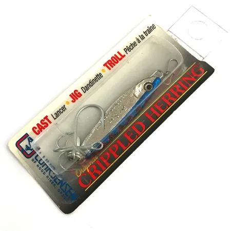 Srebrzyste i niebieskie refleksy odbijają światło na smukłym, metalowym korpusie tego klasyka od Luhr Jensen o wadze 21 g (3/4 oz). Przy długości 5,5 cm (2 1/4"), model Crippled Herring pozostaje wszechstronnym wyborem dla wędkarzy stosujących techniki spinningowe, jigowanie oraz trolling, zarówno w wodach słodkich, jak i słonych. Ten konkretny egzemplarz, oznaczony kodem produktu 5920, charakteryzuje się lustrzanym, chromowanym wykończeniem z wyraźnym niebieskim akcentem na grzbiecie – to połączenie zaprojektowane w celu imitacji wyglądu rannej rybki. Tradycja marki Luhr Jensen wywodząca się z Hood River w stanie Oregon jest widoczna w solidnej budowie i wytrzymałym pojedynczym haku, który zapewnia niezawodność podczas łowienia większych drapieżników. Jako produkt nieużywany o ocenie stanu 6, pozostaje on fabrycznie zamknięty w oryginalnym, vintagowym blistrze. Konstrukcja wyróżnia się bocznie spłaszczonym profilem typu „slab”, na którym wędkarze polegają od dziesięcioleci, aby szybko sprowadzić przynętę na dużą głębokość, zachowując jednocześnie pracę przyciągającą uwagę w różnych warunkach.