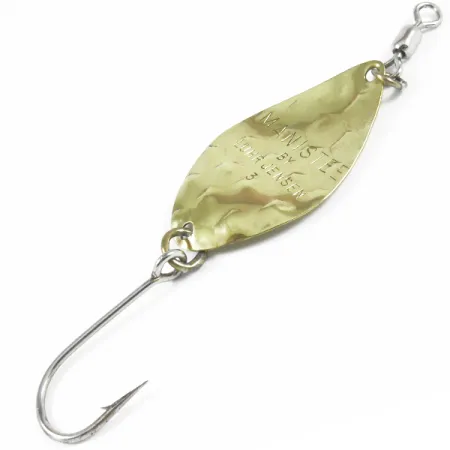 Klasyczna wahadłówka w kształcie liścia, której złote wykończenie odbija refleksy świetlne dzięki charakterystycznej, młotkowanej fakturze, typowej dla amerykańskiego sprzętu retro. Przy wadze 1/3 oz (9 g) i długości 5,5 cm (2 1/4"), Manistee 3 jest unikatowym modelem z okresu przed fuzją marki Luhr Jensen z Rapalą. Na rewersie przynęty wyraźnie wybito nazwę producenta oraz rozmiar, co pozwala zidentyfikować ją jako produkt o kodzie 3522. Egzemplarz jest w doskonałym stanie (5/5) i posiada oryginalne uzbrojenie, w tym solidny pojedynczy hak oraz zamontowany z przodu krętlik. Ten wyprodukowany w USA i niedostępny już w regularnej sprzedaży model był podstawą dla wędkarzy łowiących łososie oraz pstrągi metodą spinningową lub trollingową. Wybite napisy pozostają wyraźne, stanowiąc świadectwo rzemiosła, dzięki któremu Luhr Jensen stał się legendarną marką w regionie Pacific Northwest.
