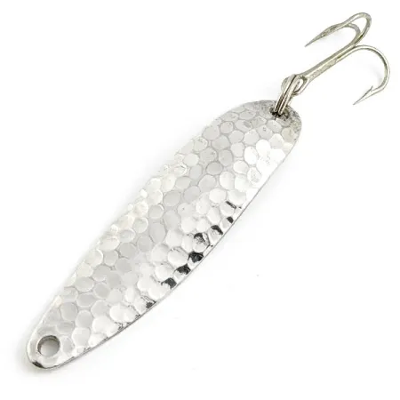 Ta metalowa wahadłówka o długości 6,5 cm (2 1/2") posiada charakterystyczną, młotkowaną powierzchnię, która maksymalizuje odblaski w wodzie. Druga strona jest gładka i posiada wyraźne tłoczenie „MAVERICK DETROIT, U.S.A.”, co dokumentuje jej historyczne pochodzenie oraz amerykańskie rzemiosło. Dzięki wadze 14 g (1/2 oz), jej solidna konstrukcja pozwala na posyłanie przynęty na duże odległości lub osiąganie konkretnych głębokości podczas trollingu. Srebrna powłoka jest wyjątkowo dobrze zachowana, błyszcząc zarówno na teksturowanej, jak i płaskiej stronie. Ten konkretny egzemplarz o kodzie produktu 16998 jest uzbrojony w mocną kotwiczkę zamocowaną na kółku łącznikowym. Przynęta zachowała stan 5/5, co potwierdza staranne przechowywanie tego egzemplarza vintage. Oczko do wiązania linki na węższym końcu jest czyste i wolne od śladów zużycia.