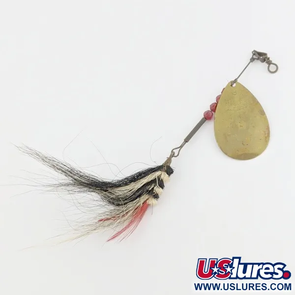 Polerowany mosiądz nadaje paletce w kształcie kropli tej obrotówki Miller #3 MFG Springwater klasyczny blask. Przy długości 10 cm (4"), przynęta waży 7 g (1/4 oz), co pozwala na dalekie rzuty. Trzy półprzezroczyste, czerwone, fasetowane koraliki tworzą kontrast na drucianym stelażu i mosiężnych elementach. Ta błystka o kodzie 24496 prezentuje kunszt Miller Fishing Lure Co., produkowany od 1929 roku. Kotwica jest gęsto uzbrojona w chwost z czarnego i białego włosia, zakończony jaskrawoczerwonym piórem. Stan ogólny jest bardzo dobry (4/5). Metalowa tulejka oddziela koraliki od oczka, zapewniając paletce swobodną pracę wokół osi.