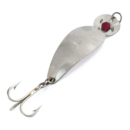 Czerwone oczka z cyrkonii, precyzyjnie osadzone w głowicy metalowego korpusu o długości 10 cm, nadają tej klasycznej wahadłówce wygląd zdecydowanie inny od współczesnego, masowo produkowanego sprzętu. Na spodzie wyraźnie wybito nazwę modelu Popeye (kod produktu 9840). Błystka posiada polerowane, niklowe wykończenie, które zachowuje jasną, lustrzaną powierzchnię. Przy solidnej wadze 28 g (1 oz), metalowy korpus charakteryzuje się subtelnym wygięciem, zaprojektowanym z myślą o dalekich rzutach i stabilnej pracy w wodzie. Uzbrojenie składa się z wytrzymałej kotwicy oraz kółek łącznikowych przy oczku i na ogonie, a całość zachowana jest w bardzo dobrym stanie, co odpowiada ocenie 4/5. Ten egzemplarz reprezentuje konkretną erę amerykańskiego projektowania sprzętu, w której użytkowa obróbka metalu łączyła się z dekoracyjnym stylem. Niklowana powierzchnia jest czysta i nosi jedynie minimalne ślady czasu, typowe dla przedmiotu starannie przechowywanego.