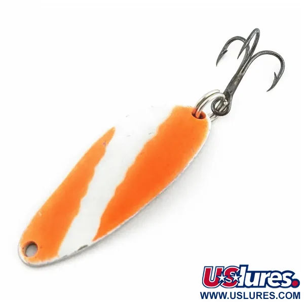 Ukośne pomarańczowe i białe pasy pokrywają przednią część tej 4-centymetrowej (1 1/2") błystki wahadłowej, tworząc kontrastowy wzór zwiększający widoczność. Na niklowanym tyle wyraźnie wybito napis „Little Cleo Wigl-Lure A Seneca Lure”, co potwierdza jej pochodzenie z linii marki Seneca. Masa 7 g (1/4 oz) oraz szeroki, wygięty korpus zostały zaprojektowane z myślą o rzutach na różne głębokości. Ta wersja wzbogacona o UV wykorzystuje reaktywne pigmenty, aby zachować widoczność w warunkach słabego oświetlenia lub w mętnej wodzie. Stan oceniany na 5/5, z wyjątkowo czystym wykończeniu zarówno malowanych pasów, jak i metalicznej powłoki. Każdy szczegół, od wyraźnych liter wybitej sygnatury po nasycony pomarańczowy odcień, jest doskonale zachowany na tym egzemplarzu nr 24555.
