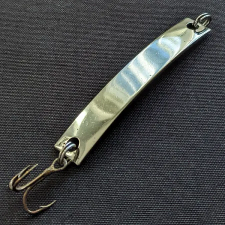 Na wypolerowanej metalowej powierzchni wyraźnie wytłoczono oznaczenie 'SKINY-MINY 1/8', identyfikujące tę smukłą wahadłówkę marki Yakima Bait. Przy wadze 1/8 oz (4 g) i długości 1 3/4" (4,7 cm), przynęta wykończona jest w estetycznej kolorystyce nikiel/czerwień, z jasnym metalicznym licem i charakterystycznym czerwonym ukośnym pasem na tłoczonym rewersie. Egzemplarz jest w stanie 5/5, wykazując świetnie zachowany osprzęt oraz powłokę zewnętrzną. Zaprojektowana do wolnego prowadzenia w trollingu, Skiny-miny została skonstruowana tak, by wykonywać od 4 do 5 obrotów w jednym kierunku, a następnie zmieniać kierunek rotacji o taką samą liczbę obrotów, co w założeniu zapobiega skręcaniu linki. Ta wyprodukowana w USA przynęta o kodzie produktu 20510 zachowała oryginalną kotwicę oraz kółka łącznikowe.
