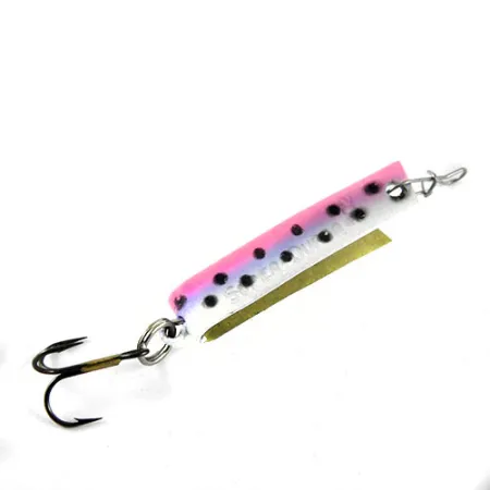 Ta niewielka wahadłówka o masie dokładnie 2,5 g (3/32 oz) prezentuje charakterystyczną konstrukcję w kształcie litery „U”, z której zasłynęła marka South Bend w modelu Super-Duper 502. Korpus o długości 3 cm (1 1/4"), oznaczony kodem produktu 1057, posiada starannie naniesiony wzór Trout (pstrąg), składający się z przejścia tonalnego od różu do srebra, urozmaiconego wyraźnymi czarnymi kropkami. Wewnętrzna strona zagiętego metalu lśni ciepłym odcieniem mosiądzu, dając odblask kontrastujący z malowaną stroną zewnętrzną. Wyprodukowany w USA egzemplarz zachowany jest w doskonałym stanie, otrzymując ocenę 5/5 dzięki czystemu uzbrojeniu i lśniącej powłoce. Oryginalne tłoczone napisy na krawędzi zewnętrznej pozostają wyraźne, a przynęta jest wyposażona w fabryczną kotwicę oraz agrafkę.