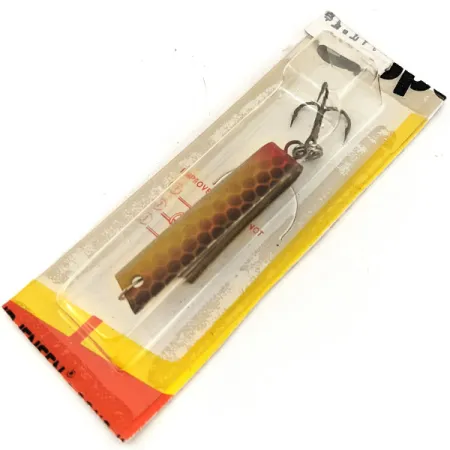 Brązowe i czerwone odcienie podkreślają wzór łusek przypominający plaster miodu na tym klasycznym, amerykańskim egzemplarzu. Model o numerze katalogowym 12843, czyli Luhr Jensen Super-Duper 503, to specjalistyczna konstrukcja łącząca cechy wahadłówki i obrotówki. Przynęta znajduje się w oryginalnym blistrze, co pozwoliło zachować jej nieużywany stan oraz wyrazistość malowania. Przy długości 3,5 cm (1 1/2") i wadze 4,3 g (1/8 oz), przynęta jest uzbrojona w ostrą, srebrną kotwicę zamocowaną na kółku łącznikowym. Na opakowaniu znajdują się konkretne wskazówki dotyczące zbrojenia, sugerujące wpięcie agrafki bezpośrednio w oczko lub użycie przyponu podczas trollingu z łodzi. Ten egzemplarz stanowi przykład jakości wykonania związanej z historią firmy Luhr Jensen z Hood River w stanie Oregon, a jego tłoczony metalowy korpus zapewnia charakterystyczną pracę w wodzie.