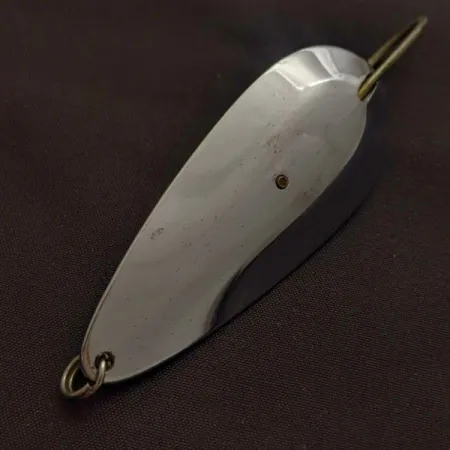 Lśniąca niklowana powłoka pokrywa całą powierzchnię tej ciężkiej wahadłówki, wyposażonej w zintegrowany druciany antyzaczep zaprojektowany do odbijania liści lilii wodnych i trzcin. Dzięki wadze 3/4 oz (21 g) gęsty metalowy korpus pozwala na stabilne, dalekie rzuty w konkretne oczka w roślinności. Stempel producenta na wewnętrznym łuku identyfikuje ten model jako dzieło Tony Accetta — specjalistyczny sprzęt do łowienia w trudnych technicznie miejscach. Egzemplarz oznaczony kodem 24618 zachowany jest w stanie 5/5, zachowując swój pierwotny wysoki połysk i gładkie wykończenie. Pojedynczy hak jest zamocowany bezpośrednio do korpusu błystki, wzmocniony konstrukcyjnym napięciem antyzaczepu. Wysoki kontrast odblasków zapewnia niklowane wykończenie, gwarantując widoczność w mętnej wodzie lub przy zachmurzeniu.