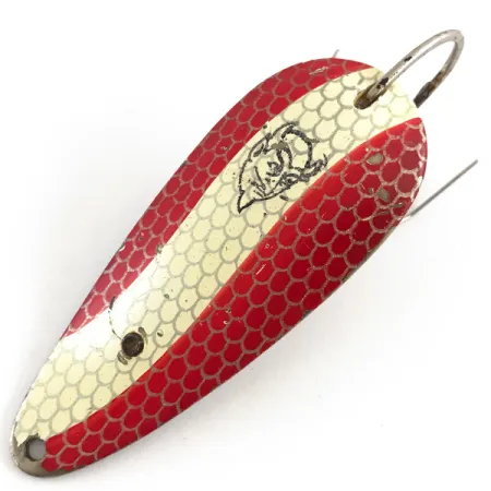 Wyrazisty, czerwono-biały wzór rybiej łuski o strukturze plastra miodu zdobi przednią stronę tej błystki wahadłowej z połowy ubiegłego wieku. Na niklowanym rewersie wyraźnie wybita jest legendarna nazwa „DARDEVLE”, identyfikująca linię przynęt Eppinger, której historia zaczęła się w Detroit w 1906 roku. Ta ważąca 21 g (3/4 oz) błystka Dardevlet ma 7 cm (2 3/4") długości i wyróżnia się charakterystycznym, podłużnym, wklęsłym korpusem, który zapewnia jej unikalną, kolebiącą pracę podczas prowadzenia. Uzbrojenie obejmuje specjalny system antyzaczepowy, wykorzystujący pojedynczy hak osłonięty dwoma drucianymi wąsami oraz czerwone włókna maskujące grot. Egzemplarz oznaczony kodem produktu 4261 zachował wyraźne logo z głową diabła, nadrukowane na kremowym pasku pośrodku. Powłoka lakiernicza nosi jedynie niewielkie ślady czasu, pozostając lśniącą i wyrazistą, co pozwala ocenić stan przynęty na mocne 4/5. Ze względu na swoją masę i konstrukcję antyzaczepową, została zaprojektowana specjalnie do siłowych rzutów w gęstą roślinność, gdzie kryją się drapieżniki.