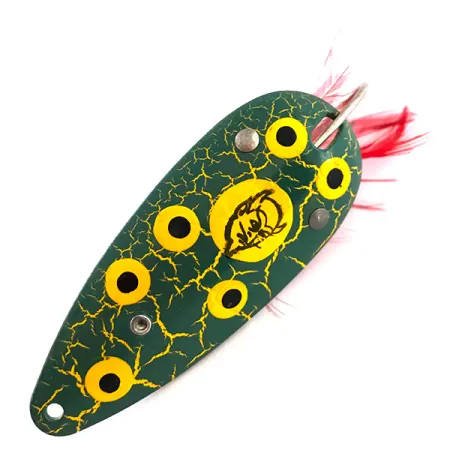 Błystka wykończona w klasycznym, zielonym wzorze „crackle” z żółtymi i czarnymi kropkami typu „frog”, co stanowi rozpoznawalną estetykę marki Eppinger. Ta wahadłówka o wadze 3/4 oz (21 g) ma długość 2 3/4 cala (7 cm) i stanowi wszechstronny rozmiar do łowienia szczupaków lub basów w gęstych zaroślach. Na przedniej stronie znajduje się centralne, żółte koło z kultowym logo Dardevle przedstawiającym głowę diabła, zamocowane za pomocą dwóch solidnych, srebrnych nitów. Po odwróceniu przynęty ukazuje się czysty, polerowany spód w kolorze srebra z wybitym oznaczeniem Dearborn, Michigan — miejsca, do którego firma przeniosła się z Detroit w 1959 roku. Jako wariant antyzaczepowy (kod produktu 5434), posiada pojedynczy hak zabezpieczony metalowym wąsem i ozdobiony chwostem z jaskrawoczerwonych piór. Ta konkretna przynęta jest nieużywana i zachowana w doskonałym stanie. Wyraźne oznaczenie „MADE IN USA” na rewersie świadczy o dziedzictwie Lou Eppingera, który produkcję krajową rozpoczął w swojej piwnicy już w 1906 roku.