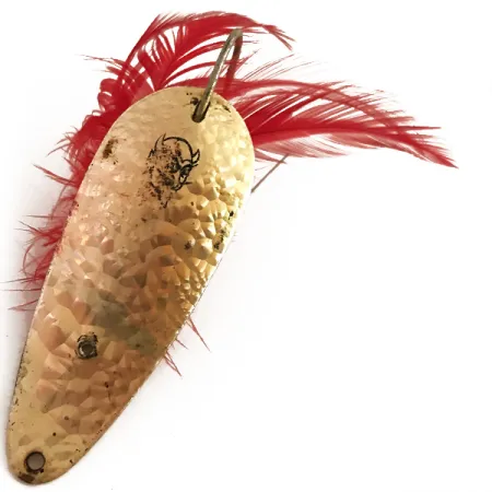 Młotkowane wykończenie „Crystal” świetnie odbija światło na całym 7-centymetrowym (2 3/4") korpusie tej klasycznej wahadłówki Eppinger – wzoru, który firma oficjalnie wycofała z produkcji w latach 80. Ten egzemplarz o kodzie produktu 4795 posiada klasyczne logo z głową diabła, wytłoczone bezpośrednio w metalu na wypukłej stronie. Przy wadze 21 g (3/4 oz) przynęta wyposażona jest w pojedynczy hak zabezpieczony drcianym antyzaczepem, co czyni ją bezzaczepowym modelem Dardevlet stworzonym do obławiania gęstych zarośli. Do trzonka haka przywiązano jaskrawoczerwone pióra, które dodają metalowemu profilowi naturalnego akcentu kolorystycznego. Stan zachowania to 5/5, a mosiężna powierzchnia metalu pozostaje bardzo czysta. Solidna konstrukcja tego amerykańskiego wyrobu podkreśla dziedzictwo Lou Eppingera z Detroit. Wklęsły spód ukazuje montaż antyzaczepu i haka, solidnie zamocowanych nitem, co zapewnia trwałość podczas prowadzenia przynęty.