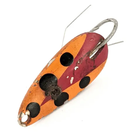 Ta wahadłówka retro o wadze 6 g (3/16 oz) wyróżnia się charakterystycznym czerwono-czarno-brązowym wzorem na klasycznym niklowanym podkładzie. Mierząca 3,5 cm (1 1/2") błystka Weedless Dardevle Midget (kod produktu 12857) posiada charakterystyczny wklęsły profil, który firma Eppinger wytwarza niezmiennie od 1906 roku. Na przedniej stronie widnieją wyraźne czarne kropki na tle dwukolorowego malowania, natomiast na rewersie znajduje się wybita nazwa producenta na polerowanej, niklowanej powierzchni. Pojedynczy hak z drucianą osłoną anty-zaczepową definiuje tę przynętę jako specjalistyczne narzędzie do łowienia w gęstej roślinności. Powłoka zachowana jest w stanie 4/5, prezentując zadbane powierzchnie, które świadczą o jej amerykańskim pochodzeniu z Michigan. Solidny drut ochronny został zaprojektowany tak, aby odbijać zaczepy, co jest cechą techniczną spójną z wieloletnią historią marki w tworzeniu trwałego osprzętu na trudne warunki.