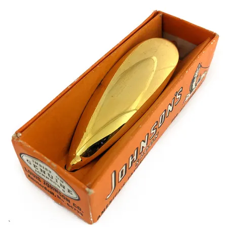 Pokryta warstwą 24-karatowego złota wahadłówka o wadze 3/4 oz (21 g) stanowi szczytowe osiągnięcie wśród konstrukcji antyzaczepowych, zapoczątkowanych przez Louisa Johnsona w 1920 roku. Ta konkretna przynęta o długości 2 3/4 cala (7 cm) posiada kod produktu 11648 i jest oferowana w oryginalnym pomarańczowym kartonowym pudełku. Dla kolekcjonera znalezienie tego wyprodukowanego w USA egzemplarza w stanie nieużywanym to rzadka okazja, gdyż złota powłoka zachowała swój pierwotny, lustrzany blask, mający wabić ryby z dużej odległości. W konstrukcji błystki zastosowano pogrubiony środek – rozwiązanie techniczne, które pozwala utrzymać hak w optymalnej pozycji podczas prowadzenia w gęstej roślinności. Na retro opakowaniu znajduje się oryginalna instrukcja dotycząca zbrojenia osłoniętego haka paskami skóry lub gumowymi wabikami, co ma na celu imitowanie rannej ofiary. Model ten prezentuje klasyczny kształt łezki oraz charakterystyczny antyzaczep, które stały się standardem w pudełkach wędkarskich na całym kontynencie. Zewnętrzna część pudełka zawiera porady wędkarskie z połowy ubiegłego wieku, podkreślające zalety tej konstrukcji podczas łowienia w oczkach wodnych i lukach w roślinności.