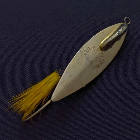 Z wytłoczoną nazwą „MARATHON” na powierzchni, ta pozłacana błystka wahadłowa typu weedless wykorzystuje stały ołowiany kil przylutowany z tyłu, zapewniający odpowiednią wagę i stabilność podczas prowadzenia. Mierząca 1 3/4" (4.5 cm) i ważąca 3/16 oz (6 g), konstrukcja opiera się na pojedynczym haku chronionym przez drucianą osłonę, co pozwala na łowienie w liliach wodnych i gęstej roślinności. Jasnożółty chwost jest przywiązany przy grocie haka, stanowiąc wizualne uzupełnienie złotego wykończenia metalowego korpusu. Ten konkretny egzemplarz jest w stanie 5/5, z doskonale zachowaną powłoką i czystym, pełnym chwostem. Kod produktu 24597 posiada charakterystyczne tłoczone oznaczenia stosowane przez producenta w latach 1929–1979.