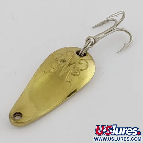 Wytłoczone ozdobną czcionką „W” na wypukłej stronie identyfikuje tę wahadłówkę o wadze 1/8 uncji (3,5 g) jako oryginalną Weller Gypsy King Deluxe. Kompaktowy korpus w kształcie kropli mierzy 1 cal (2,7 cm) i charakteryzuje się ciepłym mosiężnym wykońcezeniem, które pozostaje jasne i odblaskowe. Skatalogowana pod kodem produktu 24521, ta metalowa przynęta wykazuje precyzyjne tłoczenie i gładkie krawędzie typowe dla amerykańskiego sprzętu wędkarskiego z połowy wieku. Pojedyncza kotwica jest zamontowana bezpośrednio w tylnym otworze solidnego metalowego korpusu. Ten konkretny egzemplarz utrzymuje ocenę stanu 5/5, nie wykazując znaczącego zużycia polerowanych powierzchni ani grawerowanych detali.